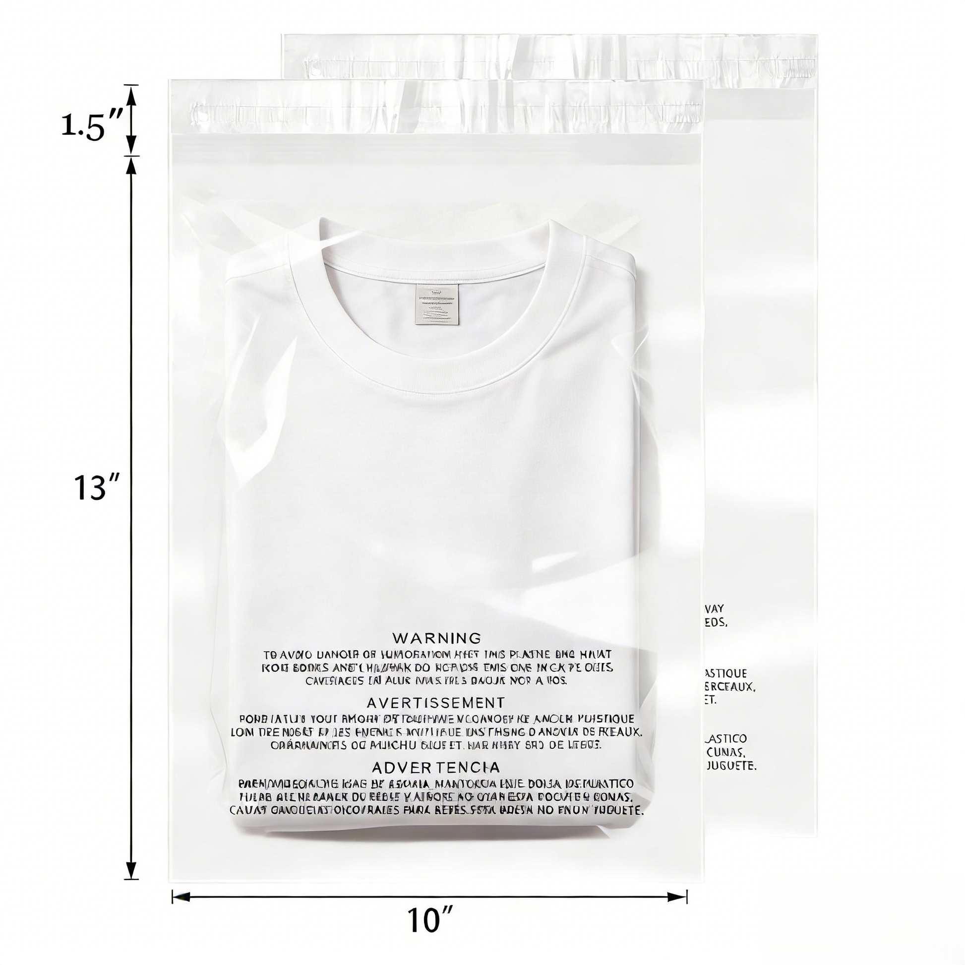 Polysells 10"x13" clear poly bags combine durability with safety compliance. These self-sealing bags feature bold black suffocation warning printing, meeting regulatory requirements for retail and shipping applications. The strong seal ensures contents remain secure during transport and storage, while the transparent material allows easy product visibility. Ideal for clothing, accessories, documents, and small merchandise, these bags offer reliable protection at an economical price point. Stock up on this essential packaging solution for your business needs.